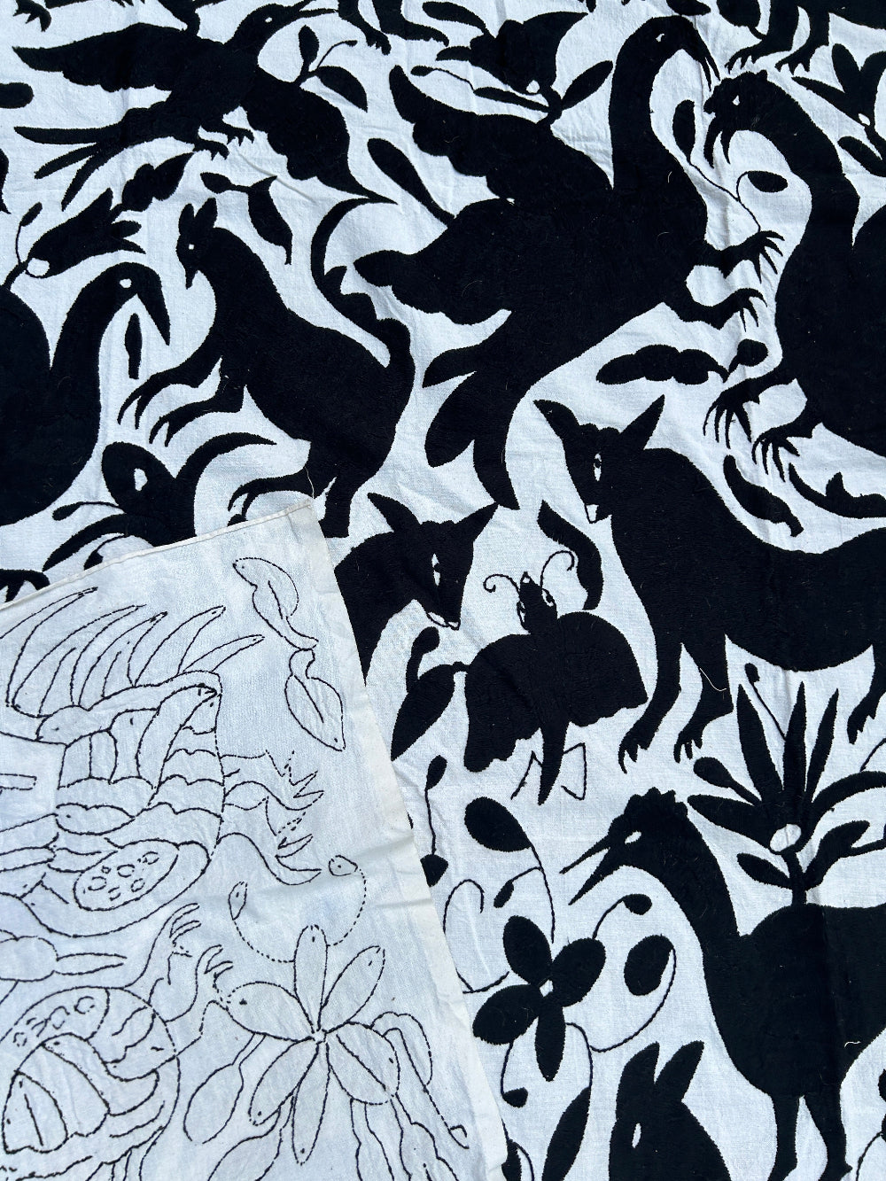 Unique handembroidered wall art. Otomi embroidery Black & Ivory 68" x 76"
