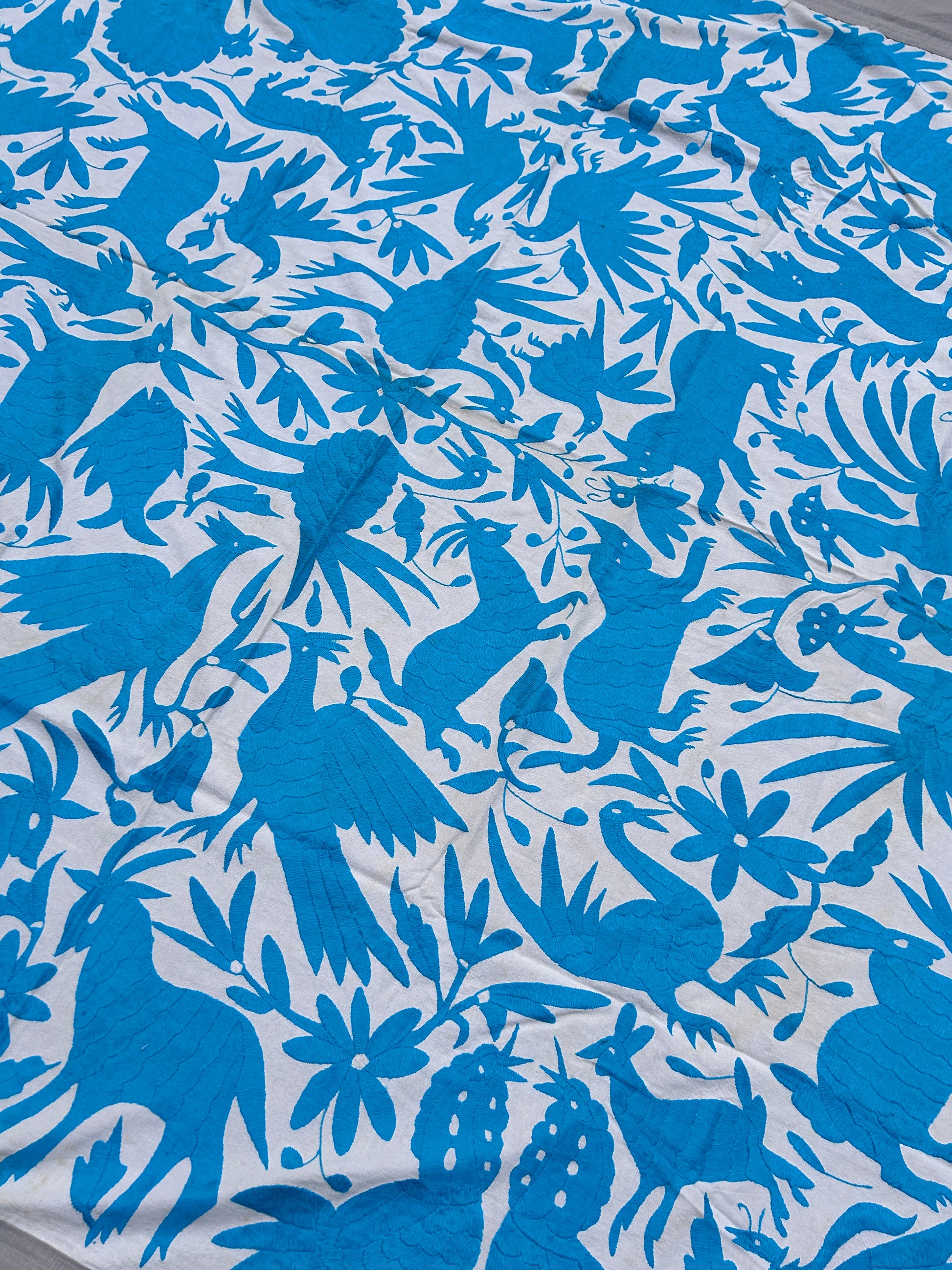 Elegant Mexican Otomi embroidered bedding (84"85") in cian & ivory. Made of cotton-linen, versatile as a tablecloth or wall art. Ready to ship, perfect gift!