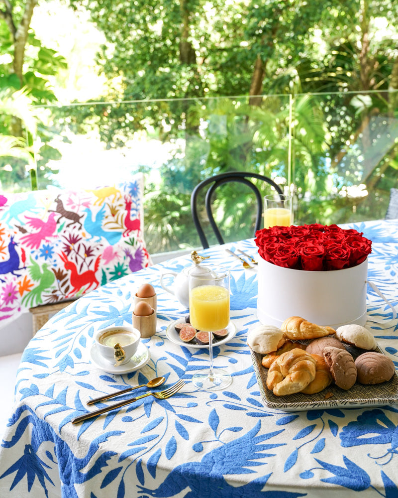 Handmade Mexican Otomi Embroidered Bedding or Tablecloth– Blue & Ivory (84"x85")