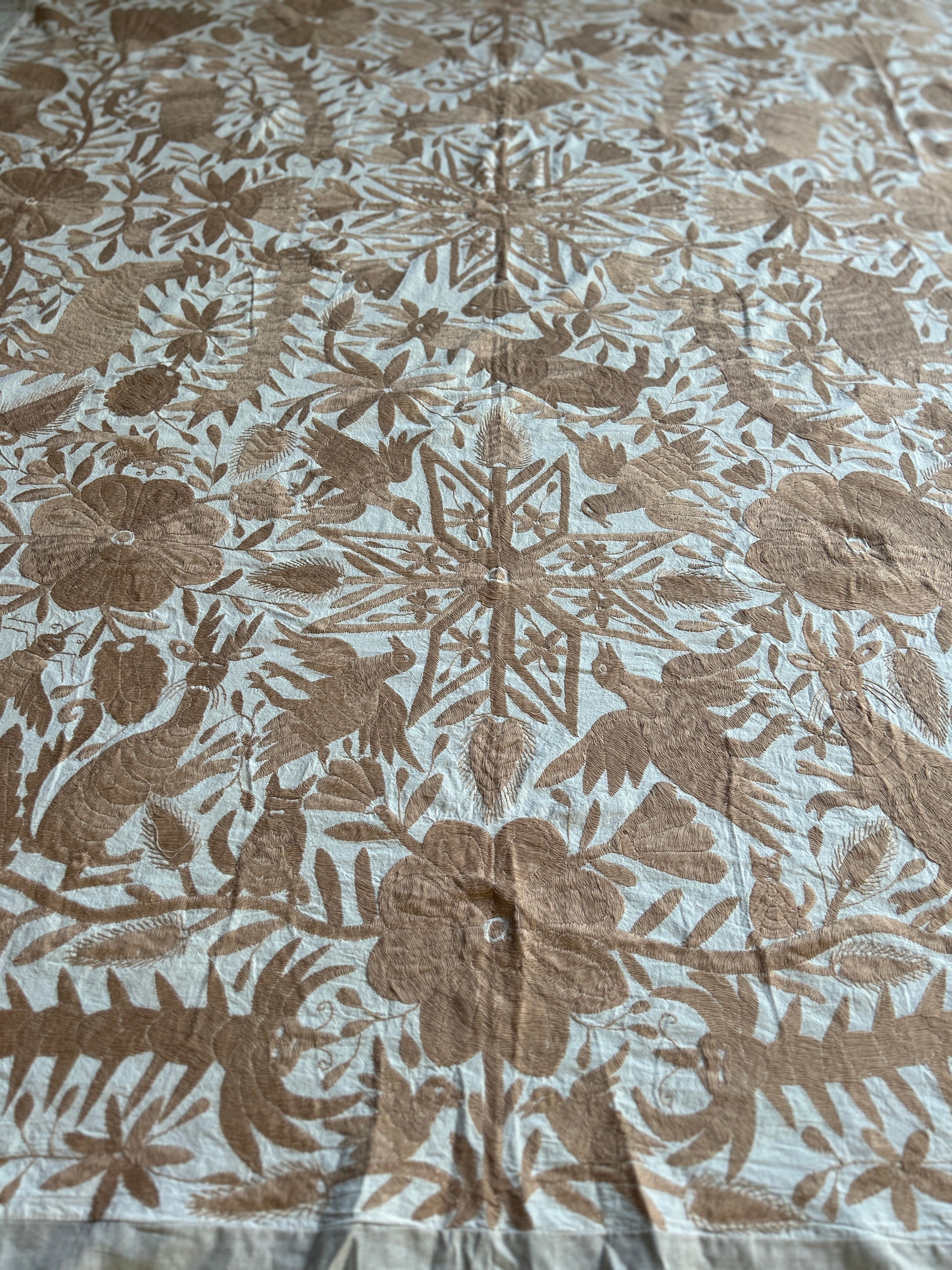 Elegant Mexican Otomi embroidered bedding (104"x116") in tan & ivory. Made of cotton-linen, versatile as a tablecloth or wall art. Ready to ship, perfect gift!